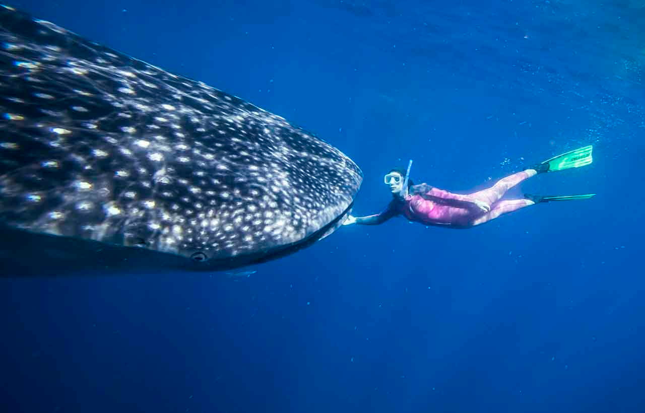 O que torna a experiência de nadar com tubarões-baleia ainda mais interessante é que, além de deixarem que humanos interajam com eles, eles também interagem. É um dos meus animais favoritos de toda a face da terra. Nadam de forma extremamente bonita, com calma, mas por serem tão gigantes, haja pernadas longas e fortes para nadar atrás deles…