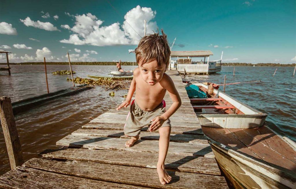 Gustavo na palafita em frente à sua casa, no Rio Canaticu, Ilha de Marajó, Floresta Amazônica. Foto tirada em 12mm com sensor crop da Nikon, resultando em 18mm.