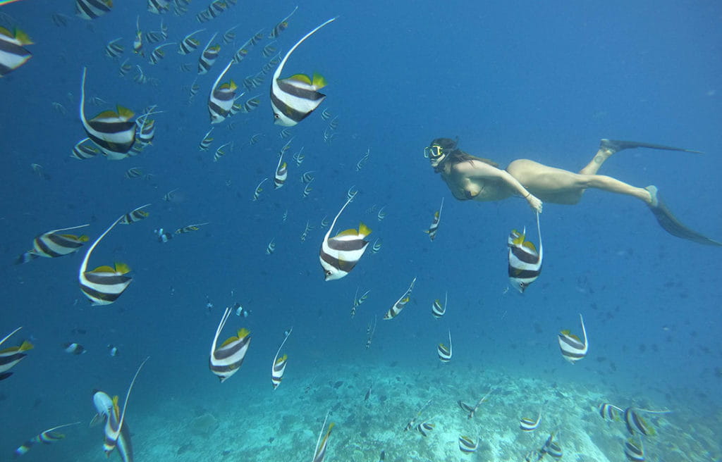 A praia da ilha em que podemos usar biquíni é bem menor; na verdade, é um espaço de 100 metros cercado para separar a praia dos locais. A praia tem uma água cristalina incrível e é rasa mesmo na maré cheia. É linda, e é uma ótima opção para snorkel com variedade grande de animais marinhos e tranquilo para crianças.