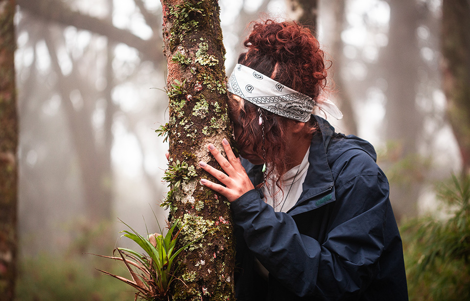De olhos fechados, ouvimos as gotas d’água tocando o solo, o mover das folhas ao vento, a presença dos animais. Respiramos o cheiro da terra molhada, da névoa e dos aromas despertos pela umidade. Tocamos cascas, musgos, folhas e brotos com a delicadeza de quem toca algo sagrado.